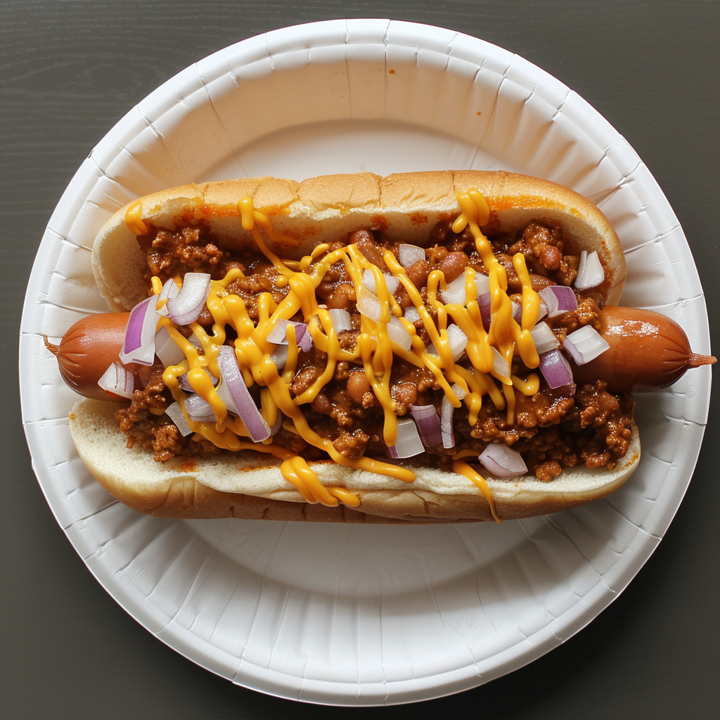 Award winning Chili.... on a Dog! Topped with Cheddar Cheese and Onions